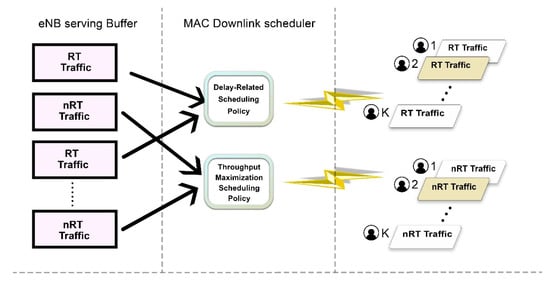 - Haci, H.; Zhu, H.; Wang, J. Novel scheduling for a mixture of real-time and non-real-time traffic. In Proceedings of the 2012 IEEE Global Communications Conference (GLOBECOM), Anaheim, CA, USA, 3–7 December 2012; pp. 4647–4652. [Google Scholar]