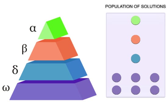 GWO approach categorizes the population of possible solutions to an optimization problem among four categories, illustrates this procedure for a group of six solutions. As shown in Figure 3, the top three optimal solutions are α, β, and δ. The remaining solutions are classified as ω wolves. The algorithm must update the hierarchy before altering the solutions in each iteration []. The populations are sorted starting from the smallest to the most significant based on their best fitness value. In a realistic optimization problem, it is difficult to determine the position of the prey (the ideal solution) beforehand. However, it is simple to come up with a solution by approximating the location of the best solution based on the high-performing members of the existing population.