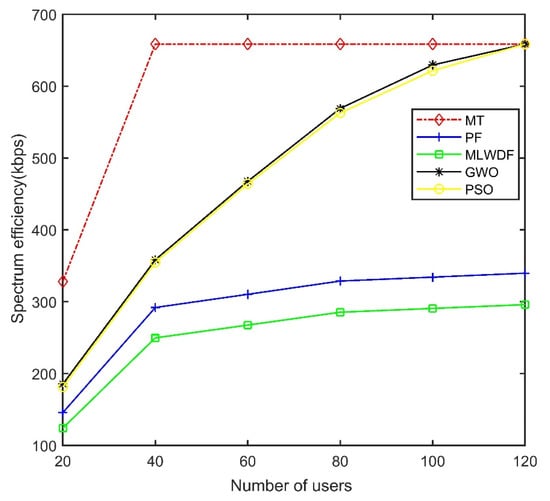 Figure 5 denotes the spectrum efficiency attained using MT, PF, MLWDF, PSO, and the suggested algorithm (referred it as GWO in figures for simplicity and clearance) for different scheduling schemes. As shown in Figure 5, the MT scheduler achieved the highest spectrum efficiency because it allocates its resources to users with the best channel condition. The proposed scheduler GWO and PSO have achieved similar results, outperforming the PF and MLWDF. They have increased efficiency with an increase in the number of users, unlike PF and MLWDF.