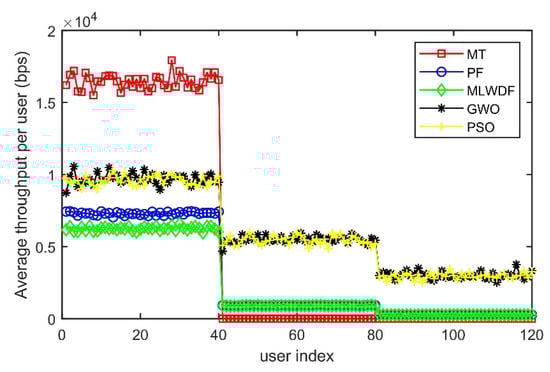 The figure shows that the MT algorithm provides maximum throughput by selecting the user with the best channel condition and transmitting it across this channel. As a result, it achieves maximum throughput for the first set of users and outperforms the alternative scheduling strategies. Additionally, the suggested algorithm GWO does not attain the peak throughput for the first group of users, but it achieves high throughput contrasted with PSO, PF, and MLWDF algorithms by 12.54%, 35.56%, and 50.90%, respectively. As shown in Figure 6, MT allocated all throughput to users in group one and made the rest of the users starve with zero throughput value. The figure shows that, in the second group, GWO outperforms PSO, PF, and M-LWDF by 8.37%, 142.93%, and 143.67%, respectively. For the last group, GWO exceeded PSO, PF, and MLWDF by 13.88%, 170.61%, and 171.48%, respectively. As PF and MLWDF depend on the CQI, even the second group users experienced very low throughput compared with the first user group. This reflects the other schedulers’ shortcoming, as mentioned in the Introduction section, and thus we compared users 10 and 50 from the first and second groups. The user in the first group outperformed the second one by 155.33% and 149.35% for PF and MLWDF, respectively.