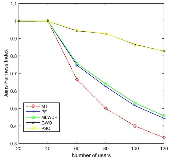 Figure 7 shows how much each scheduler has distributed throughput fairly between users in the cell. As illustrated, MT is the worst because of starving 60% of the cell users. GWO and PSO perform almost equally, as shown in the figure, but GWO outperforms PF and MLWDF by 60.33% and 57.415%, respectively, in the dense system (120 users).