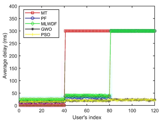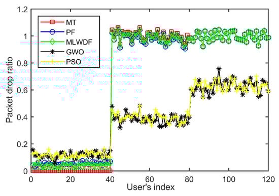 Figure 9 illustrates the ratio of the lost packets to the total number of packets for each user. MT achieved the best performance in the first group of users with zero packets lost. MLWDF and PF slightly exceeded GWO and PSO. However, in the second and last groups, GWO and PSO had an excellent performance when compared with MT, PF, and MLWDF.