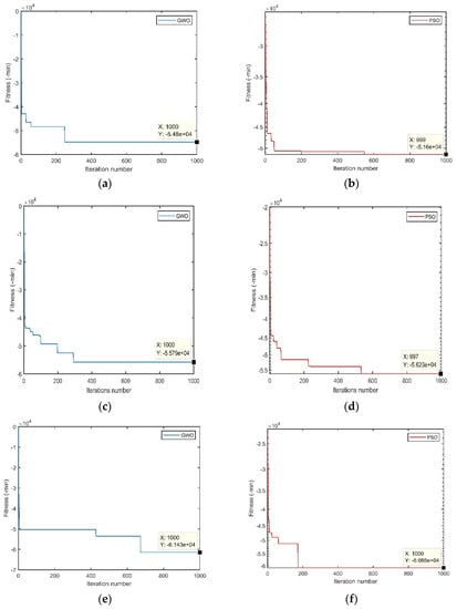 Figure 10 shows the convergence curves of GWO and PSO in different runs to reflect how many iterations each algorithm needs to reach a solution. From the curves, we can also know the value of the best solution in each algorithm. We note from Figure 10a,b that GWO reaches the best solution before PSO, and its success reaches a sub-optimal value better than PSO. We also note from Figure 10c,d that the GWO reaches the best solution before PSO, and its success reaches a sub-optimal value better than PSO. In contrast to Figure 10a,b, we find that PSO outperforms GWO while reaching a better solution. However, GWO is still faster than PSO and reaches the best solution in fewer iterations. From Figure 10e,f, we can also see that GWO has outperformed PSO in reaching a better solution. Nevertheless, PSO reaches the best solution in fewer iterations than GWO. More details and comparisons between GWO and other metaheuristic algorithms can be found on [,,,].