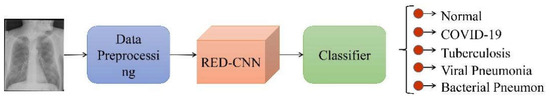 The multi-classification pulmonary disease model of this work was mainly constructed in 3 steps: the pre-processing of input data, the setup of the RED-CNN network, and the creation of the classifier. The RED-CNN network is the backbone of feature extraction, and its output is the classifier, which includes five categories: normal images, COVID-19, tuberculosis, viral pneumonia, and bacterial pneumonia. The pipeline of the processing steps is shown in Figure 1.
