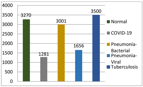 Secondly, before the combination of the two datasets, the redundant images for classification were filtered. For this reason, we eliminated the normal X-ray images in the second dataset while retaining those in the first dataset. The remaining images of these two datasets were integrated into a new dataset with five types of lung image features. The images in the new combined dataset were imaged in the same way and were all X-ray images. Various sample images in the new combined dataset are shown in Figure 2. The data distribution of each class is shown in Figure 3.
