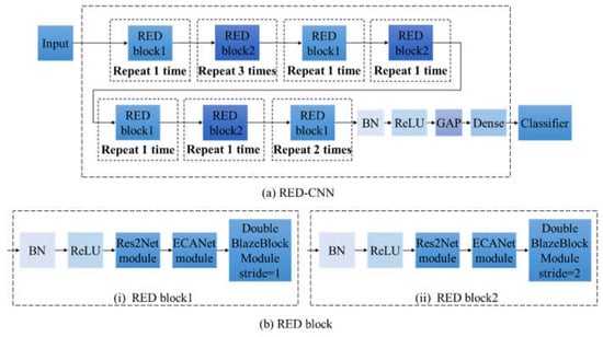 From Figure 4a and Table 1, we can see that the operation of the network is as follows: The input image sequentially goes once through RED block1, 3 times through RED block2, once through RED block1, once through RED block2, once through RED block1, once through RED block2, and twice through RED block1, BN, ReLU, GAP (GlobalAveragePooling2D), and Dense. The last part is the output, which is the result of five categories.