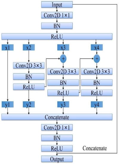 In Figure 5, the input data passes through the Conv2D 1 × 1, BN, and ReLU layers in sequence, and the output of the ReLU layer is divided into subsets, which are defined as ,. Here, we set as 4, and each subset is of the same size, i.e., the channel number is 1/s of the input. From Figure 5, we can see that is the input of the first subset, which is directly output as ; is the input of the second subset, which is transmitted through the Conv2D 3 × 3, BN, and ReLU layers to obtain the output ; the input of the third subset is the sum of and , which then goes through the Conv2D 3 × 3, BN, and ReLU layers to obtain the output ; the input of the fourth subset is the sum of and , which then passes through the Conv2D 3 × 3, BN, and ReLU layers to obtain the output . Finally, the feature fusion operation is performed, i.e., the output of the four subsets: , , , and , are concatenated. The output of the concatenated layer is subsequently input into the Conv2D 1 × 1, BN, and ReLU layer for further feature extraction and is then concatenated with the original input of the module to strengthen the use of feature information for the final output.