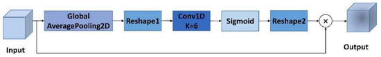 In Figure 6, the input goes through the layers of GlobalAveragePooling2D, Reshape1, Conv1D (k = 6), sigmoid, and Reshape2 in sequence. Then, the output of Reshape2 layer is multiplied with the input to realize the feature information extraction. GlobalAveragePooling2D, a global average pooling layer, is used to perform channel-by-channel global average pooling. The Reshape layers are used to reshape the size of the feature map. The Conv1D layer captures the cross-channel information interaction, and its parameter k is the number of adjacent channels, which is set to 6, indicating that 6 adjacent channels participate in a channel attention prediction. The sigmoid layer is the activation layer with a sigmoid activation function.