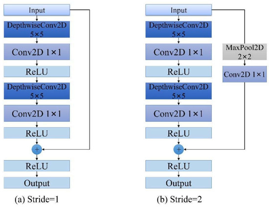 Figure 7 shows that the Double BlazeBlock module has two types of block structure with stride = 1 and 2. The stride is step size. When stride = 1, the input data sequentially goes through DepthwiseConv2D 5 × 5, Conv2D 1 × 1, ReLU, DepthwiseConv2D 5 × 5, and Conv2D 1 × 1 layers, and then the output of the Conv2D 1 × 1 layer is combined with the original input data. Such an operation is called as information fusion. After that, the output of the information fusion step is fed into the ReLU layer and then output. When the stride is 2, the block structure is almost the same as that of stride = 1; the difference is that instead of directly being fused, before the fusion step, two new operations are added to the input data: MaxPool2D 2 × 2 and Conv2D 1 × 1. The two added operations can help better extract feature information and reduce the image resolution. Among all the operations in Figure 7, DepthwiseConv2D is a depthwise separable convolution, which can not only extract image features but also effectively reduce the network parameters. Conv2D 1 × 1 is a general convolution for feature extraction. MaxPool2D 2 × 2 is the maximum pooling layer, which reduces the image resolution during the sampling process. The Double BlazeBlock module can not only enhance the use of feature information but also effectively reduce network parameters.