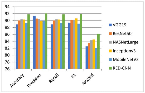 It can be seen from Table 4 and Figure 8 that the average evaluation values of the RED-CNN network for accuracy, precision, recall, F1, and Jaccard values are 91.796%, 92.062%, 91.796%, 91.892%, and 86.176%, respectively, better than other networks. This means that our new network can identify pulmonary diseases more efficiently than the other networks.