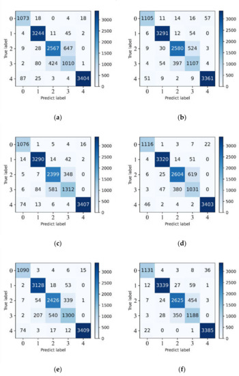 Overlapped confusion matrix of different algorithms: (a) VGG19; (b) Resnet50; (c) NASNetLarge; (d) Inceptionv3; (e) MobileNetV2; (f) RED-CNN. In the graph: 0 represents COVID-19, 1 represents normal, 2 represents bacterial pneumonia, 3 represents viral pneumonia, and 4 represents pulmonary tuberculosis.
