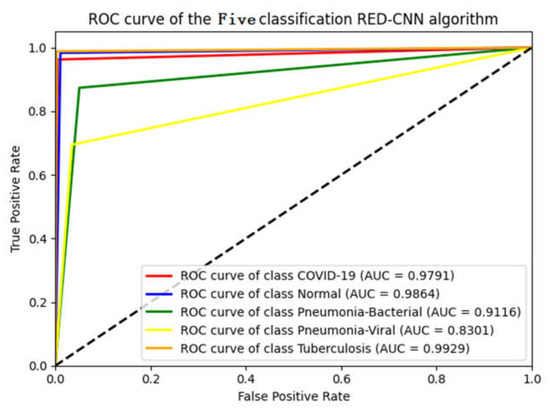 As is shown in Figure 10, based on the classification of the RED-CNN network, the average AUC values of the five categories, i.e., COVID-19, normal, bacterial pneumonia, viral pneumonia, and tuberculosis, are 0.9791, 0.9864, 0.9116, 0.8301, and 0.9929, respectively. This demonstrates that the RED-CNN network has excellent classification performance for each category.