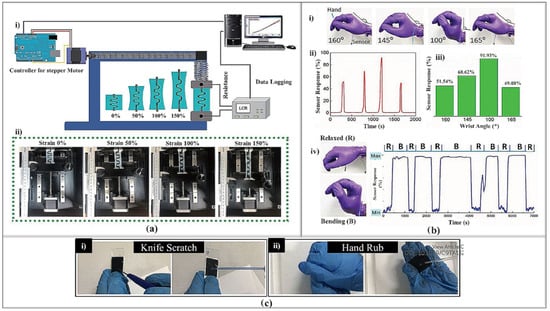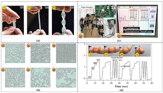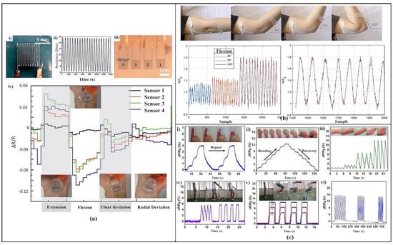 A poly(3,4-ethylene dioxythiophene) polystyrene sulfonate multiwall carbon nanotube (PEDOT: PSS/MWCNT) liquid-based strain sensor was introduced by Jabbar et al. [44], where a soft substrate (Smooth-On) was used along with the liquid solution using 3D printing fabrication techniques to retain sensor’s conductivity and stretchability with 30% strain up to 1000 cycles along with gauge factor of 89.4. The sensor is highly stretchable and was tested by a custom-made system to test the stretchability of the sensor, as shown in Figure 6a(i). Conversely, Figure 6a(ii) shows the optical images of the sensor at 0, 50, 100, and 150% strain. The designed sensor worked as a feedback sensor with the robotic leg, making it applicable in wearable electronics. On the other hand, Bhattacharjee et al. [37] presented a strain sensor based on poly(3,4-ethylenedioxythiophene) polystyrene sulfonate polymer liquid incorporated inside the PDMS material to achieve a strain of 30% and an extremely high gauge factor of 12,000. The sensor bears the deformability at certain angles, as shown in Figure 6b(i). Alternately, Figure 6b(ii) shows the temporal response of the sensor at bending and Figure 6b(iii) represents the behavior of the sensor at different bending angles. Finally, the real-time analysis of the sensor was conducted at different bending (B) and relaxation (R) cycles, as shown in Figure 6b(iv).