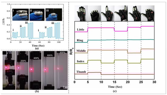 Conductive metal liquid-based strain sensors: (a) analyzing the resistance change of the sensor at different sizes [77]; (i) analyzing resistance change through bending an index finger by grabbing a large object; (ii) medium object; (iii) and small object (b) testing the stretchability at different strains [98]; (c) real-time analysis of the change in resistance by movements of the fingers [99].