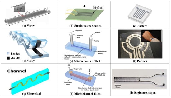 Sinusoidal structure patterning has been used in recently reported studies [44,45] for stability, high strain, high sensitivity, and to reduce the memory effect. Apart from this, liquid metals are injected into microchannels or tubes made of the soft silicon substrate, as shown in Figure 7g [37,48,49,50,73,91,94,95,96,97,105,107]. The liquid metal circuit with a wearable touchpad with a z-film seal that enables direct electrical contact with the skin was patterned by Lu et al. [101]. Similarly, a new structure was developed by Votzke et al. [104] that mimics a dog bone shape and helps to achieve low hysteresis as well as high durability as shown in Figure 7i. Furthermore, strain-gauge-shaped channels were adopted in [72,99,103] to help in deformation and motion monitoring applications.