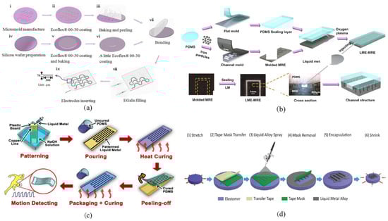 - Gao, Q.; Li, H.; Zhang, J.; Xie, Z.; Zhang, J.; Wang, L. Microchannel Structural Design for a Room-Temperature Liquid Metal Based Super-stretchable Sensor. Sci. Rep. 2019, 9, 1–8. [Google Scholar] [CrossRef]