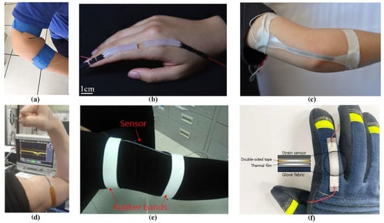 Applications of wearable strain sensors: (a) strain sensor designed to monitor movements [73]; (b) wearable strain sensor to detect finger movement [40]; (c) wearable sensor to detect elbow flexation [103]; (d) sensor worn to detect bicep muscle tuning [109]; (e) wearable sensor to detect the motion of the knee [91]; (f) attaching a sensor to a firefighter’s glove to detect motion [110].