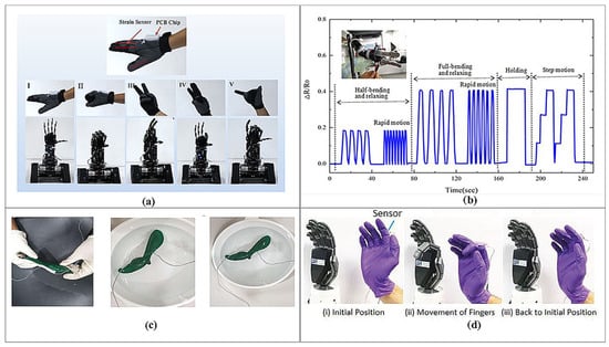 Flexible strain sensor application in robotics: (a) controlling a robotic hand from the remote position [72]; (I) original state (II) hard fist (III) bending 3 fingers (IV) bending 2 fingers and (V) and bending 4 fingers (b) the sensor is attached to the robot joint to analyze the movement [77]; (c) the sensor attached to the legs under water [45]; (d) to move the robotic finger as feedback, the sensor is attached in the human finger [37].