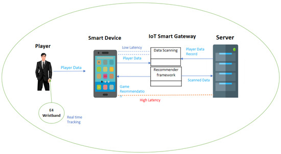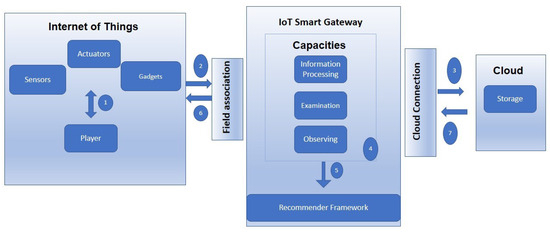 The moves toward performances are considered: 1—The player connects with the “things” right after the framework runs. 2—Since the actuators, switches, and sensors are at the boundary, they have to speak with the smart passage. Wi-Fi, Zigbee, near0field communication, and Bluetooth low-energy are the most well-known correspondence conventions utilized. 3—The smart passage has information stored in the cloud if necessary. 4—The information from the sensors is handled. 5—The Internet of Things framework takes information from the smart door and the cloud and plays out the handling. 6—The framework obtains the effects of the completed investigation. 7—If fundamental, information is stored in the cloud utilizing the relevant correspondence convention. We utilize smart Bluetooth LE for our smart devices to speak with our framework, gathering information from player studies. Moreover, the framework puts away user information from the data set through HTTP. In the designed IoT framework in Figure 2, we attempt to accomplish low idleness in the information handling, keeping the handling nearer to the player’s application and device. Along these lines, the IoT smart entryway screens information handling, wiping out many calls to the cloud. This plan helps with endless choices, further developing the user’s experience.