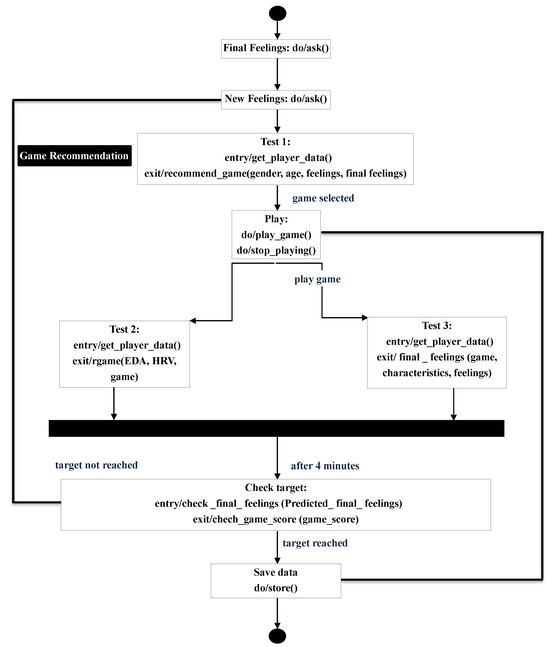 In the accompanying, we suggest the connection points of the models planned. At first, the framework obtains some information regarding his/her ongoing profound condition and the feeling he/she needs to accomplish. The framework will suggest a game because of the information recently gathered by different users, permitting the user to pause (e.g., due to fatigue, laziness, around others). Moreover, the user can begin the game unless arriving at the ideal last inclination, or the framework modifies the game. The framework will gather information from the user who cooperates with the game. The gathered boundaries are stored in a data set in which the suggestion calculation will attempt to prescribe fresh games to users. With this information, we ascertain a “profound score of the game”, grouping the various feelings of the players through their advancements in two tomahawks: fiery (connected with the player’s energy) and sound (regarding the player’s demeanor). This point will inform us whether the player is advancing accurately and approaching the ideal last condition. When the season of the momentum game is finished, the framework gives the user the option to proceed or alter the game in light of the assessed last mindset. When the player arrives at the last express, the player will obtain some information regarding his/her present status, so this information can be appended to more readily appraise the suggested games for upcoming users.
