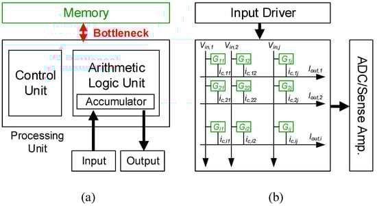 To comply with the emerging processing technologies of smart cities, autonomous driving, and AI robots, a tremendous amount of data needs to be efficiently processed [1,2,3,4,5]. However, the existing von Neumann computing structures shown in Figure 1a have limitations, because distinct areas are separated for dedicated roles [1], which causes heavy traffic in data transmission, inducing a significant efficiency drop and vast power consumption [2]. To overcome these problems, there is a growing interest in “compute-in-memory” (CIM) that mimics the human brain neural network. In CIM, the power efficiency and decision fidelity are significantly improved if multi-level data are processed in parallel and linearity of output is secured [3]. In the implementation of artificial intelligence, with constructed with secured linearity, neural network structures are suitable for in-memory computing in a cross-bar structure, as shown in Figure 1b [4,5,6]. The special features of the cross-bar structure are that each cell maintains the weight data in the form of cell conductance (); the cell current () then appears as the product of the analog input voltage () and the cell conductance. Each row accumulates the cell current from cells within the row to generate the output current (), which is the result of the multiply-and-accumulate (MAC) calculation, as shown in Equation (1) [7].