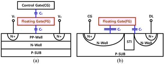 As is much smaller than 0.5 in the floating gate FET, the quadratic term in the current equation can be further reduced if additional coupling capacitance between FG and drain, , is inserted, as shown in Equation (4):