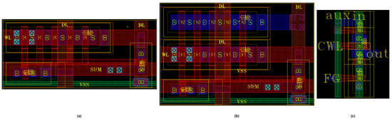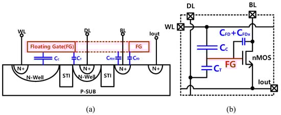 If the cell is replaced with a floating gate FET, as shown in the right example in Figure 2b, the current equation is modified because of the capacitive voltage division and the coupling between the floating gate and drain node, as shown in Equation (3), where and are the FG-drain coupling capacitance and total capacitance observed from the FG, respectively. The nonlinearity because of the secondary effect is mitigated by the capacitive coupling.