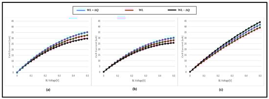 Drain current as a function of BL voltage for (a) CTT, (b) 2C-1T, and (c) 3C-1T cells.