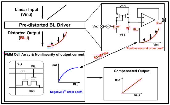 Figure 6 shows a schematic illustration of a method for linearity improvement of the current behavior of a charge trap FET cell. The cell has the same structure as a traditional EEPROM. The drain voltage is boosted using a pre-distorted BL driver, to compensate for the attenuating current increment of the drain voltage. After careful observation of the convex behavior of the current response of the non-linear charge trap FET cell, as shown in Figure 5a, a BL driver transforms the input to drain voltage in a concave way, similarly to a parabolic response, which is similar to the pre-emphasis technique in the communication circuit, with which the transmitter driver inversely distorts the signal as much as it is expected to be attenuated while traveling to the receiver [15]. As mentioned earlier, the cell is as small as the EEPROM cell; the area overhead for linearity enhancement in the FG FET is placed with circuits in the BL driver, which is shared by all cells in a column. The sequential processing of a non-linear BL driver with a concave transfer function and a non-linear cell with a convex current behavior is expected to cancel each other, resulting in a linear relation between the input voltage and drain current.
