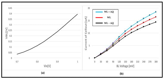 (a) Voltage transfer curve of the pre-distorted BL driver and (b) the CTT cell current.