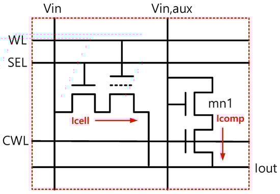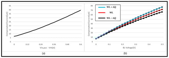 As in the pre-distorted BL driver, the auxiliary path functions when the input voltage is greater than the threshold voltage. Therefore, the input driver for the auxiliary input, , is a simple shift of by . The total cell current is expressed as in Equation (6). The quadratic term is completely eliminated when . The CMW switch was added to block the current flow through the compensation path during programming and erase operations, to include a weight update step.
