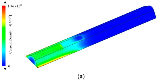 The current density in the armature was mainly distributed near the current excitation end, i.e., the current skin layer. The maximum current density was distributed at the inner throat of the armature, and the current density at the armature head was almost zero, which was the result of the current conduction along the shortest path, and the armature current distribution of the two structures was consistent. The armature current density distribution and the current density distribution on the contact surface of the armature rail are shown in Figure 3.