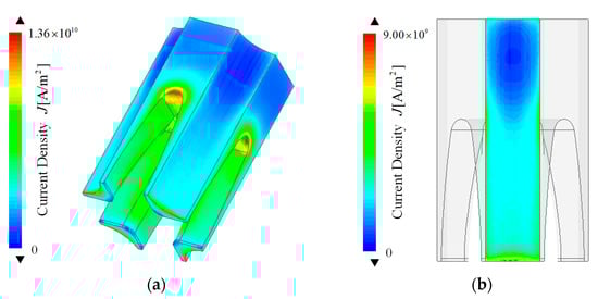 Current density distribution is an important electromagnetic characteristic of electromagnetic rail launchers. The current density distribution of armature–rail structures affects the distribution of the internal magnetic field intensity of an electromagnetic rail, and it reflects the distribution of the force and heat source of the launcher. Additionally, it has an important influence on the calculation of the inductance gradient. Because the current density distribution of the four-rail electromagnetic launcher has central symmetry, the quarter rail was analyzed, and the current density cloud diagram is shown in Figure 2.