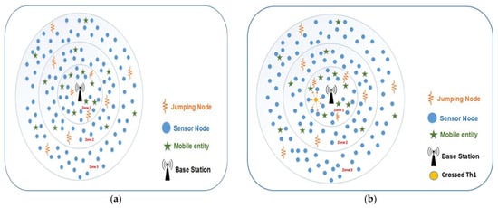 Zone 1 nodes are more likely to fail than zone 2 and zone 3 sensor nodes as a result of forming the previously specified zone surrounding the base station, hence we can expect a greater demand for mobile entities in zone 1. Zone 1 will have 12 mobile entities, zone 2 8 mobile entities, and zone 3 only 5 mobile entities. In the same way, zone 1 has a greater number of leaping nodes than zones 2 or 3.