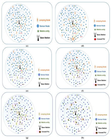 As shown in Figure 1, Figure 1a explains overall proposed system. Figure 1b depicts that ME in neighbouring nodes is being checked by the node. Here it should also be mentioned that the yellow sensor node scouring its 1-hop neighbour for the mobile object seen is as shown in Figure 1a. Figure 1c shows ME awaited arrival at the charging station. Further, its shows that a mobile entity arrives and charges the sensor node before moving on to another sensor node or base station. A sensor node sends a message to the base station as shown in Figure 1d. When no ME could be found in Figure 1d, the sensor node contacted the base station, which was able to detect and route the nearest ME to SN. The sensor node was charged as it got closer to ME as shown in Figure 1e. It shows the ME arriving at the failing sensor node and charging it. Figure 1f depicts the failure of many nodes. Multiple nodes failed at the same time as shown in Figure 1f, and there was no ME available; thus, the sensor node contacted the base station. The jumping node has been alerted as depicted in Figure 1g. It also shows how base stations find jumping nodes and guide them towards failing nodes. Figure 1h shows that backup has been received. Here we can see how jumping nodes arrive at failing nodes and replace them, allowing the failing nodes to resume operation.