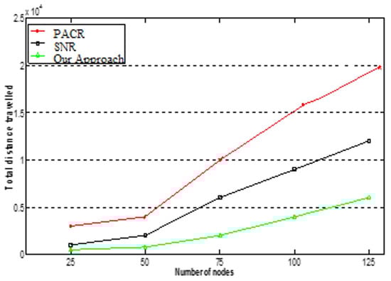 The results were all within 10% of the sample mean, with a 90% confidence interval. The analysis is carried out using the results of all three proposed approaches, including PACR [15] and SNR [25]. We have got the results right here. The entire distance travelled for relocation vs. the number of nodes added is depicted in Figure 2. The proposed strategy surpasses existing baseline techniques, according to the results, because only recovery nodes are shifted during operation. The number of cascaded relocations is reduced as a result. As a result, the suggested methodology has a shorter average distance travelled than the other methods investigated. The proposed method consistently outperforms previous strategies as the network’s node count grows. The main reason for this is that the proposed method restricts node motions, which causes more network fragmentation. In terms of performance, PACR outperforms other algorithms. The key reason for the increase in performance is PACR working approach. As the number of nodes in the network rises, the network’s backbone becomes stronger, allowing the recovery mechanism to become more competent and trustworthy, resulting in improved performance. Aside from that, PACR assumptions are unrealistic, and in the event of a topology change, they would result in a significant increase in packet exchange costs. When compared to PACR, Figure 3 indicates that our technique still performs admirably.
