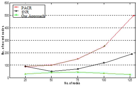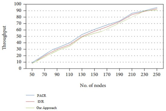 The throughput produced by each of the three methods is compared in Figure 4, which shows the comparison in regards to the total number of nodes. The throughput is measured in terms of the number of bits that are transmitted in a certain amount of time (second). If all of the transmitters and receivers follow the same channels and are not required to change their radio between channels, we believe that we have achieved 100% of the theoretical throughput over the whole network. It takes a node two hundred microseconds to change its radio from one channel to another, which reduces the period of time that can be devoted to transmission and, as a result, the amount of data that can be sent in one second. It also indicates that our proposed methodology is upgraded relative to the baseline techniques. The total number of nodes increases, which results in an increase in the throughput overall.