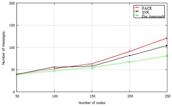 Figure 5 illustrates the effect that the overhead has on the lifetime average of sensor nodes as a function of the size of the network. We compared the node lifetime when PACR, SNR and proposed techniques were utilised, with particular attention paid to the average lifetime when no recovery mechanism was implemented. It has come to our attention that the lifespan average drops when the number of nodes in the network is increased. For instance, while using 50 nodes, the two strategies provided lifetime averages that were extremely similar to the case when there was no recovery. On the other hand, in sparse networks, PACR performs somewhat better than proposed technique. When applied to dense networks, the proposed technique shows improved performance, with efficiencies of 83.76%, 84.84% and 87.3% for SNR, PACR and proposed technique, respectively, with 250 nodes. When the proposed technique is utilised, there is a significantly lower occurrence of interferences and retransmissions, which is directly responsible for this result. On the other hand, the network lifetime is increased as a result of the failure of an articulation node, which causes WSN to become non-functional. The implementation of a recovery strategy will, thus, extend the lifetime of the network even though it will produce some additional overheads. Regarding the benefits that can be gained from the various recovery strategies, we believe that the reduction in the average node lifetime is still quite negligible. Therefore, compared to the other baseline techniques, the suggested methodology performs better in extending the network’s lifespan.