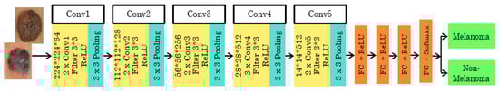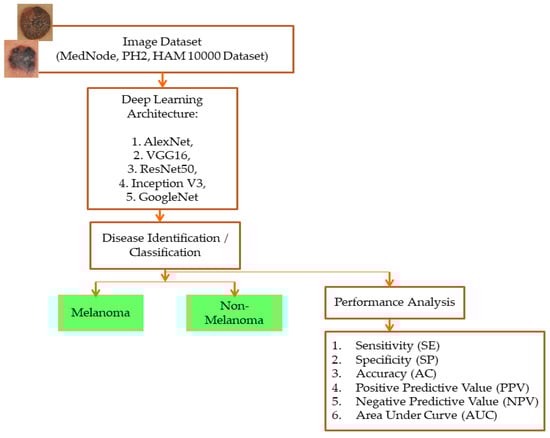 The proposed system uses five models that have already been trained (ALEXNET, VGG-16, RESNET50, INCEPTION V3, and GOOGLENET), and all of the models went through the same training process. All of the pre-trained models initialized their weights from the ImageNet database before training on the dataset. The layers utilized in the architecture and the straightforward model are the convolutional layer, normalization layer, ReLU layer, pooling layer, fully connected layer (FC layer), and SoftMax layer. According to the validation data and frequency, all of the proposed pre-trained networks are trained using the stochastic gradient descent momentum at a learning rate of 0.001, with a maximum of 50 epochs. The information is randomly shuffled each epoch. The network has been taught and offers reliable validation. The proposed pre-trained models can be adjusted or altered based on the classification stages by the advantages of transfer learning, and the output is classified as melanoma and non-melanoma in the testing phase. Figure 1 depicts the proposed system’s framework.