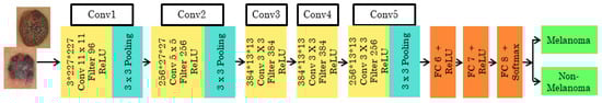 With zero center normalization, the pre-trained architecture is called ALEXNET, and the input dermoscopy image with size/operation is resized to 227*227*3. The AlexNet structure has the size and operation of the 5 convolutional layers combined with the Rectifier Linear Unit (ReLU) activation function. According to the convolutional layer’s size and operation, the filters differ as 11*11, 5*5, and 3*3. Each convolutional layer is arranged with size and operation, Overlapping Max Pooling, Stride, and Kernel. The 3*3 filter/kernels and 2 strides are used in the Max Pooling layer. The depth of each of the five convolutional layers along with ReLU activation function varies as 96, 256, 384, 384, and 256. Zero padding is seen in conv1, but from conv2 to conv5 it is noted as 2, 1, 1, and 1. Finally, 4096 channels and 1000 classes can be changed according to the need of the classification layers. The architecture of ALEXNET is shown in Figure 2.