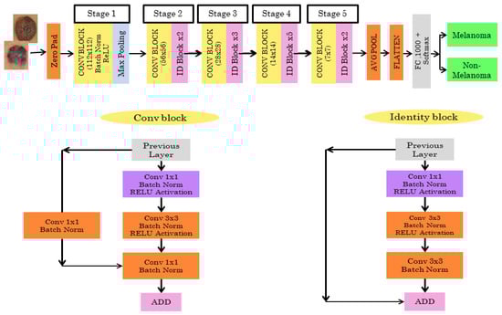 The Resnet50 architecture has 5 stages combined with two layers known as convolutional and identity block/layer. The Resnet50 architecture is shown in Figure 4. In Stage 1, the skin cancer input image is given to the first layer which consists of 7*7 size, 64 different filtering layers, and size two strides. In Stage 2, the feature region is selected by the max pooling layer with stride 2. The stage 2 convolution layer consists of nine layers. Stage 3, 4, and 5 have 12, 18, and 9 layers, respectively, which include filtering and activation layers. In the end, the average pooling is connected to 1000 nodes, and at the end, 1 SoftMax function gives us the output. The output is classified as melanoma or non-melanoma.