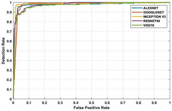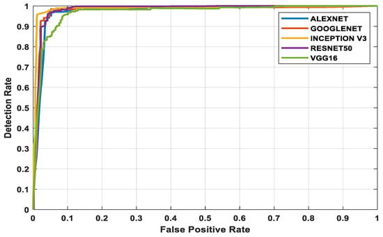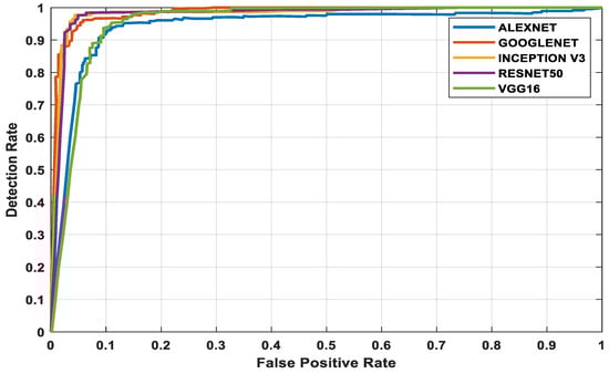 The three datasets—MedNode, PH2, and HAM10000 Kaggle—are given as input data to the pretrained architectures AlexNet, Vgg-16, ResNet50, InceptionV3, and GoogleNet, which are used as the final classification layers in the fully connected layer. The target set for the classification is also given to this layer and this is the decision-making layer. The input size, a parameter which is used for all models, is the same, except that the number of layers differs according to the network used. The proposed parameters are tabulated in Table 2. The performance analysis for the MedNode dataset, PH2 dataset, and HAM10000 Kaggle dataset is given in Table 3, Table 4 and Table 5. The receiver operating characteristic curve (ROC curve) graph, which shows the classification model at all thresholds, is given in Figure 7, Figure 8 and Figure 9. The ROC curve is between the detection rate and false positive rate. If the values are above the saturation point, the accuracy is higher; thus, the performance and classification of the network model are considered the best classification model.