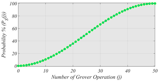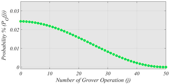 Therefore, based on (19) and (22)–(25), the matrix representation of the Grover operator (G) can be calculated. Furthermore, the Grover operation can be repeated based on (12) 50 () times. In this example, and are the probability of the solution and the probability of a non-solution state (e.g., ) after the Grover operator, respectively. To show the effectiveness of Grover’s algorithm, Figure 6 and Figure 7 show the values of and (for ) for . Based on Figure 6 and Figure 7, after each iteration of the Grover operator, the probability of the desired solution, that is, state , is increased. Furthermore, the probability of after 50 Grover operators is very close to 100%. Based on the results, Grover’s algorithm is successful at finding the solution by making the probability of the solution near 100%.