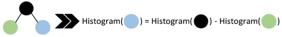 Generally, as shown in Figure 4, after the black node splits into green child nodes, the histogram of the blue node can be obtained directly from the black node minus the green node, which greatly reduces the time overhead.