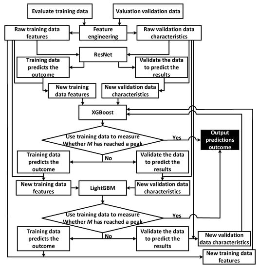 Through the above analysis, the XGBoost and LightGBM models are combined to obtain the XGB+LGBM iterative framework, and the new features are used for iterative learning training. Figure 5 is the flowchart of the DXL model, and the specific steps of the model are as follows: