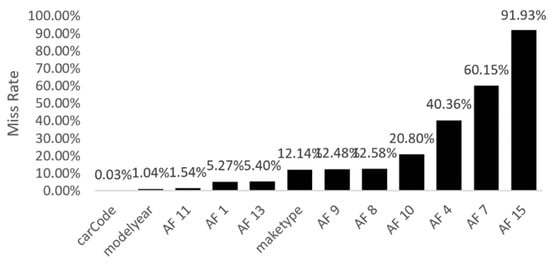 Through statistics, it is found that there are 15 attributes with missing values, excluding features with missing values accounting for more than 15%, and less than 15% of the features are national standard code, year model, manufacturer type, anonymous feature 1, anonymous feature 11 and anonymous feature 13, and the missing value of the integer data in these features takes the majority of the feature, while for floating-point data, the missing value takes the average value of the feature. The missing data are shown in Figure 6.