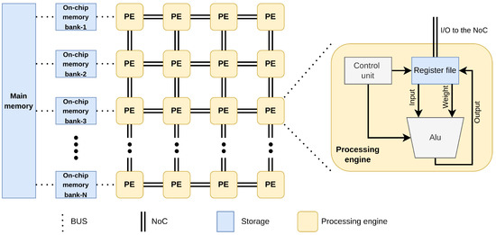 This work is focused on dataflow architectures, such as [6,7], often referred to as spatial arrays. Contrary to systolic arrays, where the computation patterns are fixed and scheduled by a main control, with no data reuse at the PE array level (no local memory except for I/O or datapath registers), spatial arrays leverage distributed control units to organize the data processing. Each processing engine has its internal control unit and register file; the latter is used to store input and partial results. A typical accelerator with a spatial array includes a memory hierarchy, normally composed of the system’s main memory (off-chip memory, DRAM), the internal main memory (on-chip memory, SRAM), and local memory, often implemented as a register file. Finally, point-to-point communication within the array of processing engines is managed by interconnections, often implemented as a network on chip (NoC). The overall architecture is depicted in Figure 1. The map-space on dataflow architectures is considerably larger than the one of systolic arrays because more hardware settings need to be configured [8,9]. The scheduling is usually carried out by minimizing cost functions that associate estimated performance metrics to the total data movement required to execute the workload [6,8]. These cost functions comprehend all significant energy and latency contributions due to data movement, such as MAC energy, memory read/write energy at every level, and communication through the NoC. Frameworks such as [8,9,10,11] create an abstract hardware model of the target accelerator and search the map-space by optimizing the aforementioned cost function for energy, latency, or both.