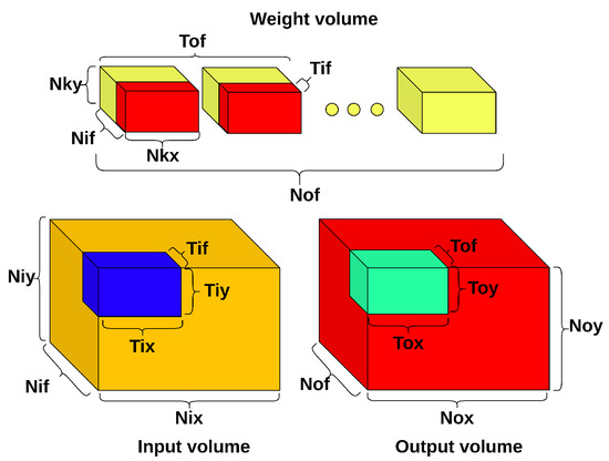 Temporal tiling divides the data volume at a particular memory level in sub-volumes, as depicted in Figure 2. For each temporal tiling level, the memory footprint of the tiled volume identified with the tiling factors Tb, Tof, Tif, Tox, and Toy is defined as the buffer space required to store inputs, weights, partial sums, and outputs used during the computation. The memory footprint can be evaluated as shown in Equation (1). Precision here refers to the bit-width of the datatype.