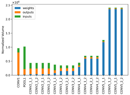 In order to understand how inter-layer reuse can impact the communication efficiency, the normalized weight and pixel volumes for ResNet18 for ImageNet [2] are reported in Figure 4. Notice that pixel volumes dominate the first half of the CNN, whereas weight volume dominates the second one. Since inter-layer reuse depends on the volume of intermediate pixels, inter-layer scheduling can improve the hardware metrics only in some portions of the CNN, particularly where the volume is dominated by pixels. In this case, the execution of the first half of the CNN could be optimized by fusing layers, whereas the second half would be scheduled using traditional single-layer techniques since inter-layer reuse would be negligible.