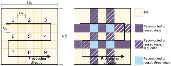 One potential problem that can occur during layer fusion, as observed in [12], is that the intermediate pixels within adjacent tiles are re-computed again if not adequately buffered. This redundancy is present during standard processing and is described in the four reuse opportunities in Section 3. Figure 6 depicts the overlapping of the spatial dimensions of a feature map during the processing. The overlapping depends on the stride and the spatial dimensions of the tile, feature map, and kernel map. In [12], it is demonstrated that recomputation can account for up to 10 times the original energy cost estimated with single-layer scheduling; therefore, overlapping pixels must be stored in appropriate buffers. The overlapping regions Ox and Oy between adjacent tiles, depicted in Figure 6, can be evaluated as shown in Equation (7). In Section 4.1, a solution to the re-computing problem is presented, improving the one proposed in [12], from the observation that some overlapping regions are immediately reused during the computation.